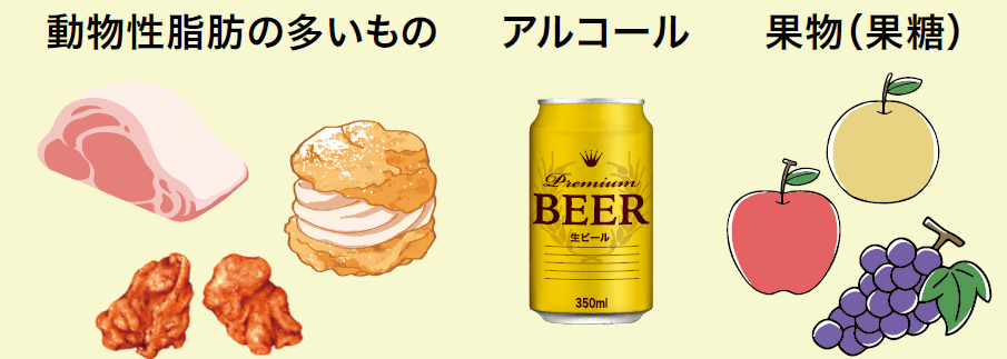 脂肪の多いものだけでなく、甘いものやお酒なども体脂肪のもとになります。